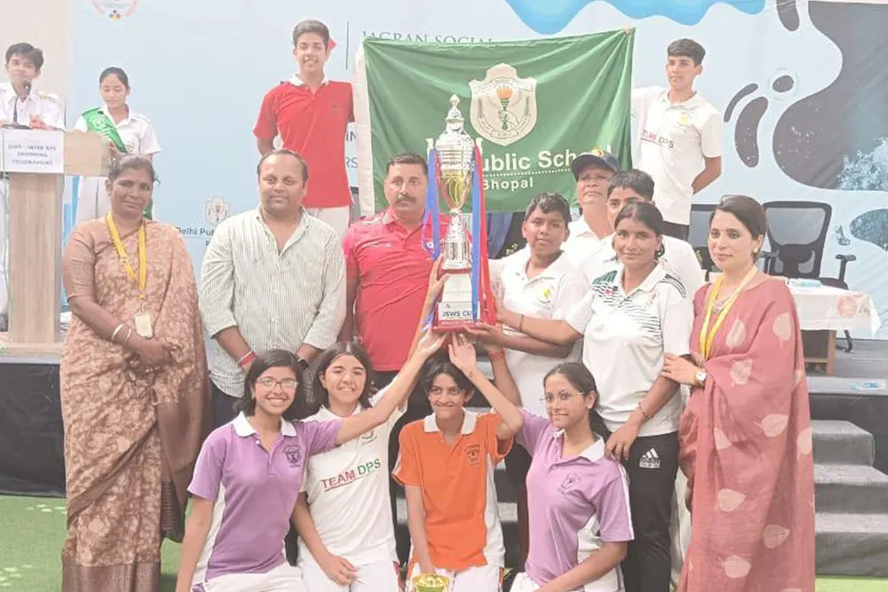 The ace swimmers of Delhi Public School Bhopal emerged victorious in the 1st JSWS Cup Swimming Competition hosted by DPS Rau and lifted the Cup with a lead of 83 points. The Swimming Team was dexterously mentored by Coach Captain Manoj Kumar Jha and Ms. Neelam Sharma and guarded by coach Mr. Azam Kidwai and Mr. Bharat Lal Yadav.